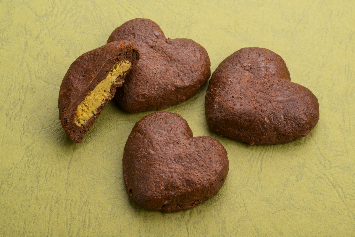チョコレート生地の中に、なめらかなピスタチオのペーストを入れ、ザクザクとした食感
